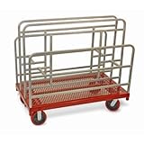 | ✚✚✚ Raymond Products 5018 Heavy Duty 8" Quiet Poly All Swivel Casters Cross-Brace Panel/Sheet Mover With Anti-Skid Platform Industrial quality construction guarantees many years of heavy duty performance. This super duty cross-brace Panel/Sheet Mover truck is ideal for transporting and storing building materials, partition panels and more. Adjustable uprights allow you to arrange the position of each of the uprights or take them out completely. Platform base is 14-gauge robotic welded steel, reinforced with 12-gauge steel ribs for a super solid strength. Powder coated for a superior paint finish. Platform coated with anti-skid polyvinyl. Four adjustable powder coated uprights with 4-cross braces for an added stack bars. Load capacity 3200 lbs. Platform Dimensions: 30" x 54" overall, 11-3/4" from floor to top of base with 8" casters, 8-1/2" between upright sockets. 4 waterfall uprights are extended 2- 27" and 2- 37" above base.