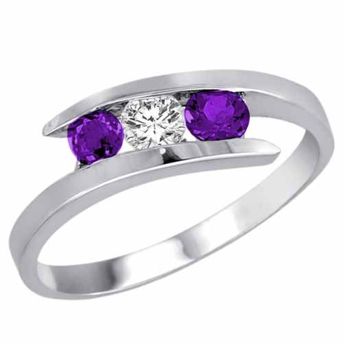 Platinum Three 3 Stone Round Diamond & Amethyst Accented Channel Set Bypass Ring (1/2 ctw) Size 10